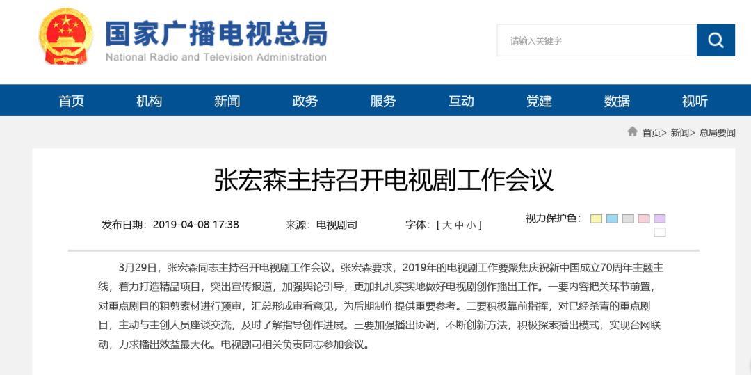 3月29日,国家广播电视总局副局长张宏森主持召开电视剧工作会议。张宏森要求,2019年的电视剧工作要聚焦庆祝新中国成立70周年主题主线,着力打造精品项目,突出宣传报道,加强舆论引导,更加扎扎实实地做好电视剧创作播出工作。