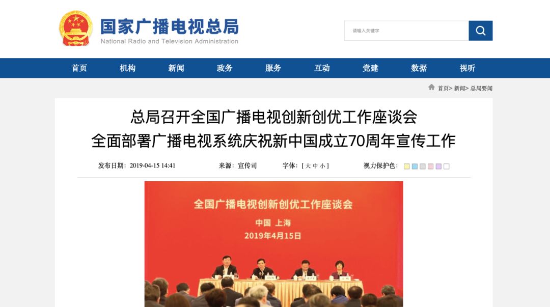 4月15日,全国广播电视创新创优工作座谈会在上海召开,中宣部副部长、国家广播电视总局局长、党组书记聂辰席出席会议并讲话,进一步动员部署全国广播电视系统庆祝新中国成立70周年宣传工作,进一步推动广播电视创新创优工作深入开展,并提出四个要求: